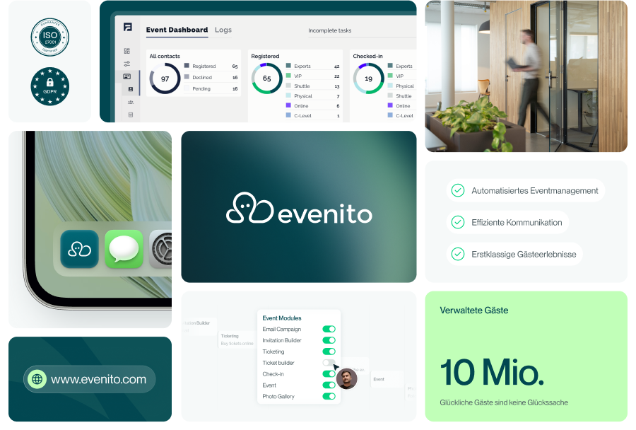 evenito vereint den gesamten Event Lifecycle in einer zentralen Plattform, von Registrierung und Kommunikation bis hin zu Streaming, Check-in und der Auswertung. Gerade für Enterprise-Teams ermöglicht evenito die zentrale Kontrolle bei gleichzeitig dezentraler Umsetzung. Das reduziert die Komplexität, erleichtert die Arbeit für Event-Teams, sorgt für konsistente Prozesse und macht hybride Eventprogramme skalierbar.