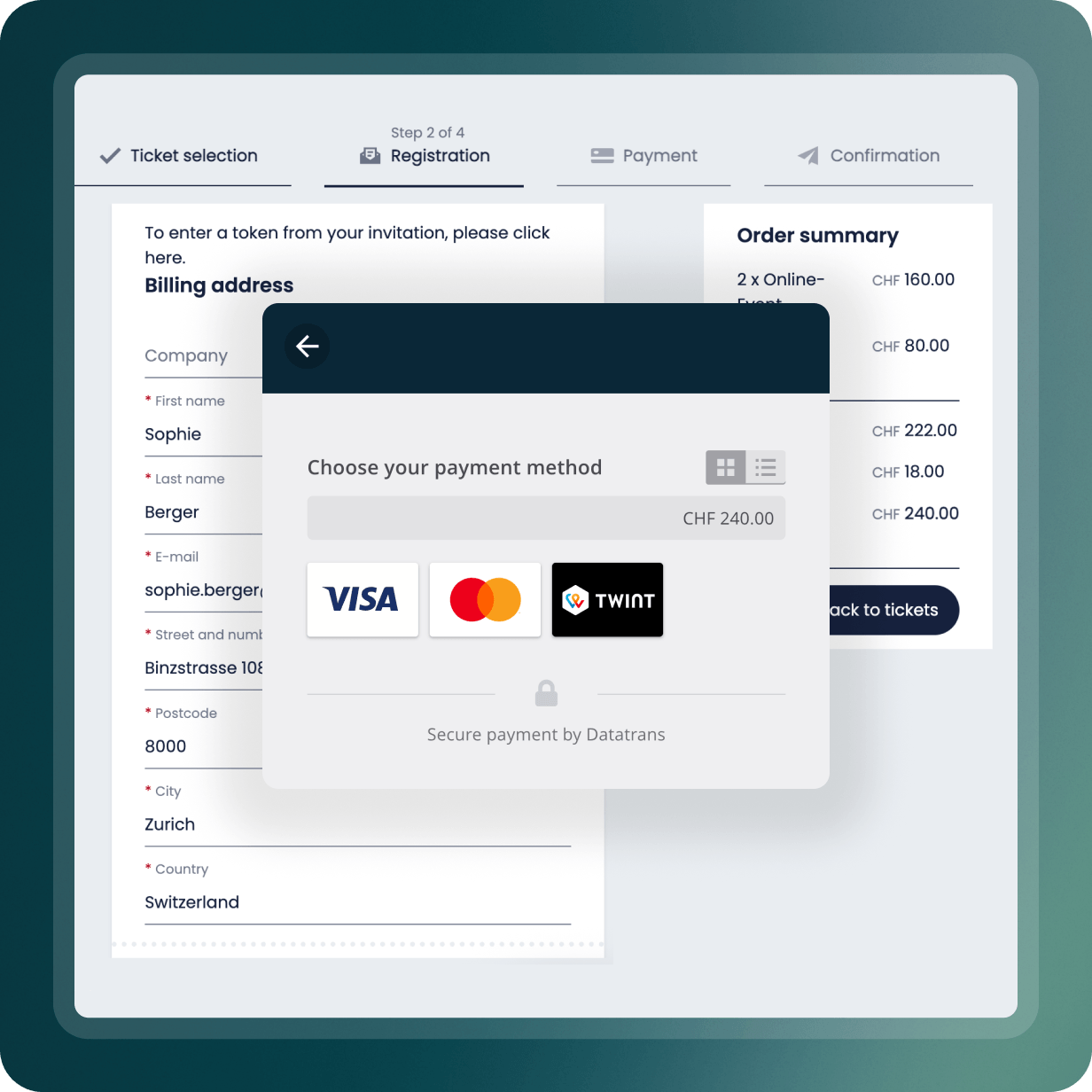Guests can decide for themselves whether they want to pay with a credit card, TWINT, Google Pay, Apple Pay or another service provider. This creates a smooth checkout process, as you know it from online shopping.