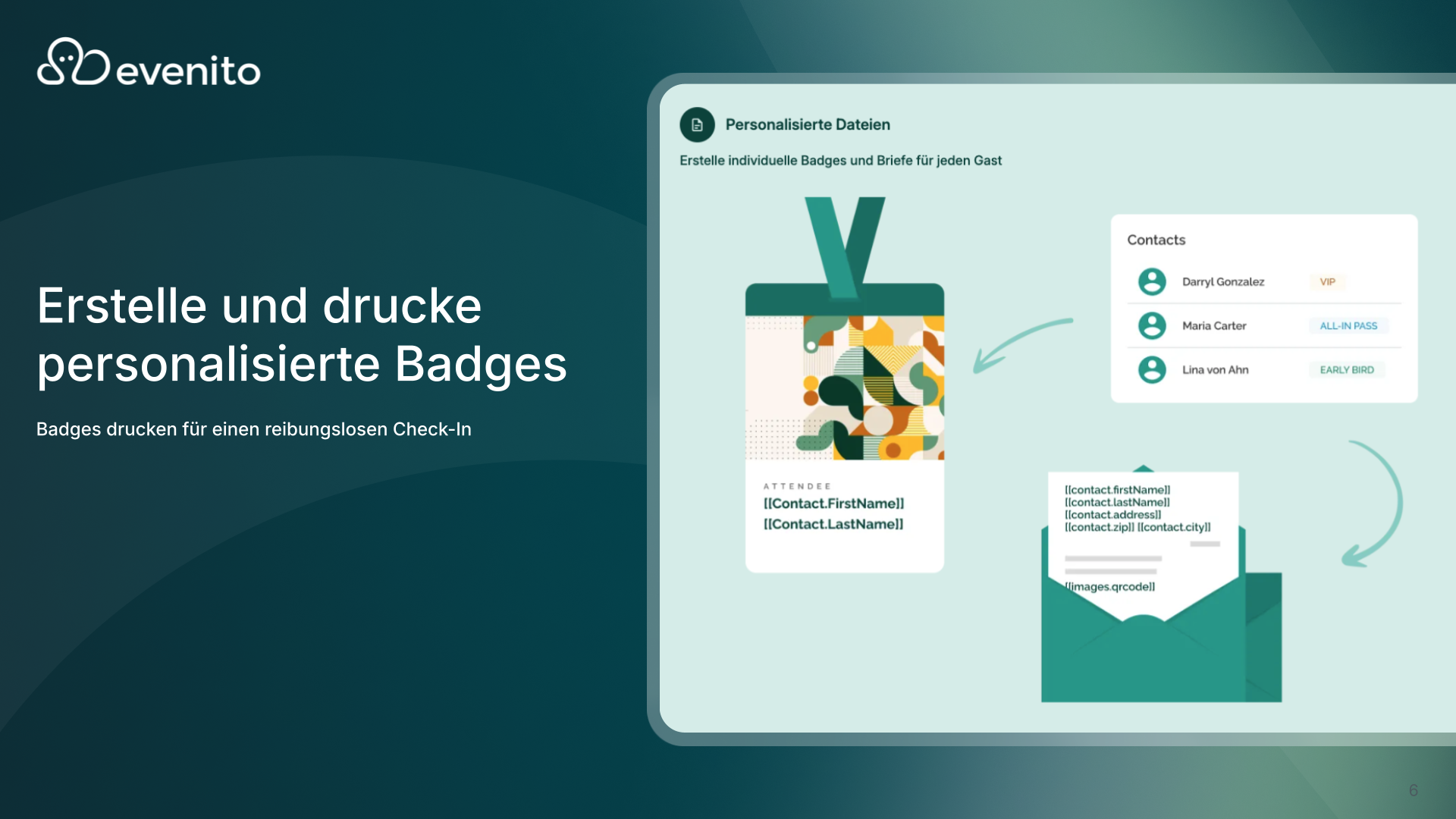In this course, you will learn how to set up personalized badges technically and make them available for your event. You'll learn how to design badge templates in the lettershop module and store them in evenito with the correct file type. You will also learn how to prepare the check-in module for badge printing and how to trigger the printing process in the back office. We'll show you how to use the print preview and what you should pay attention to in advance when it comes to hardware compatibility and testing so that you can react flexibly to the needs of your guests on the day of the event.