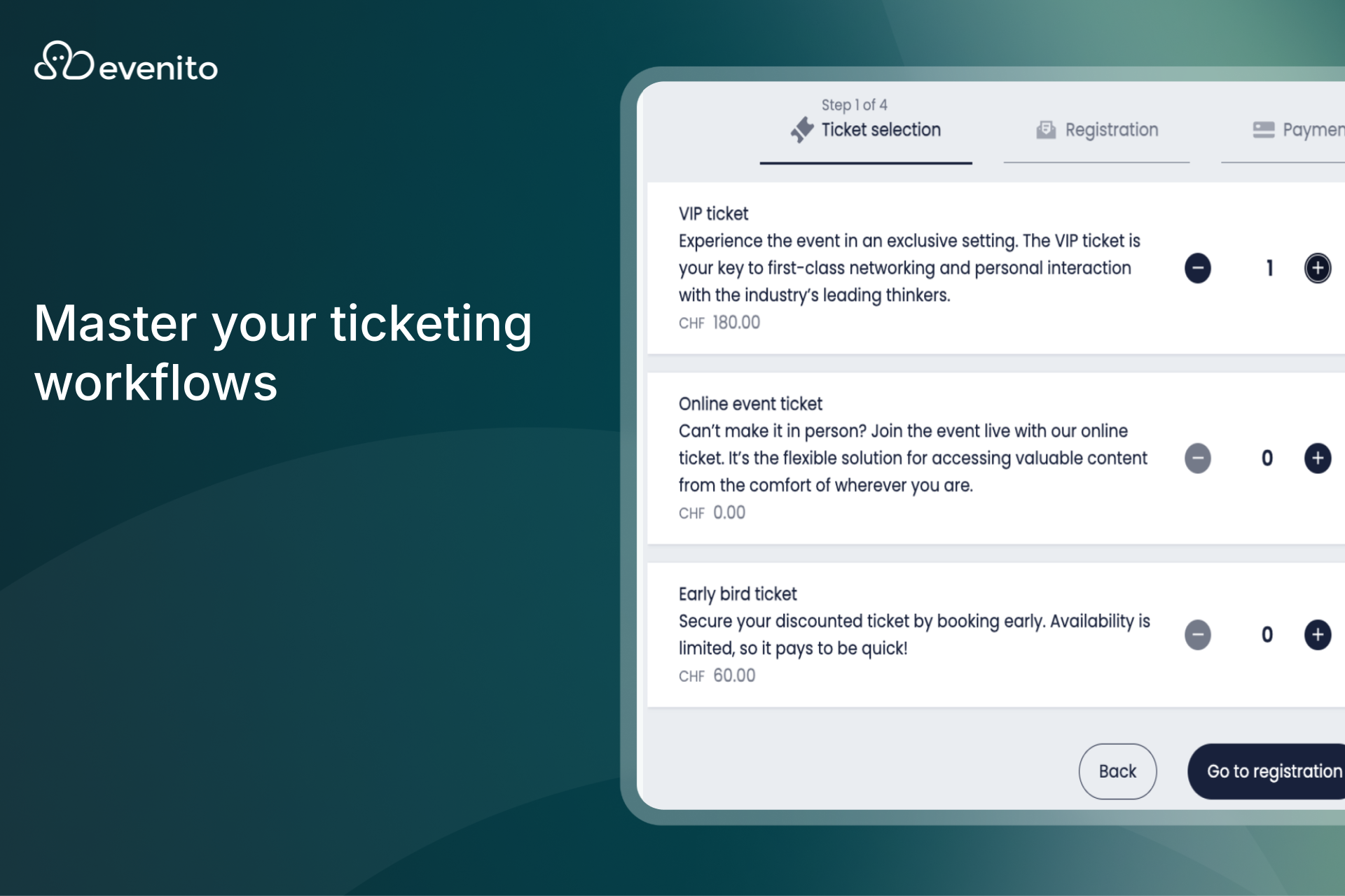 In this comprehensive course, you will learn how to set up the ticketing module in evenito from scratch and professionally manage it. You'll learn how to configure ticket types, manage quotas, and publish the store on your website. We'll guide you through the entire buying process from a participant's perspective and show you how to manage invoices in the back office, draw exports for accounting and securely process cancellations. You will also get to know the central seller list in order to evaluate transactions across events. A particular focus is on advanced setups, in which you combine ticket purchases and free registrations in one event and target different target groups via separate websites.