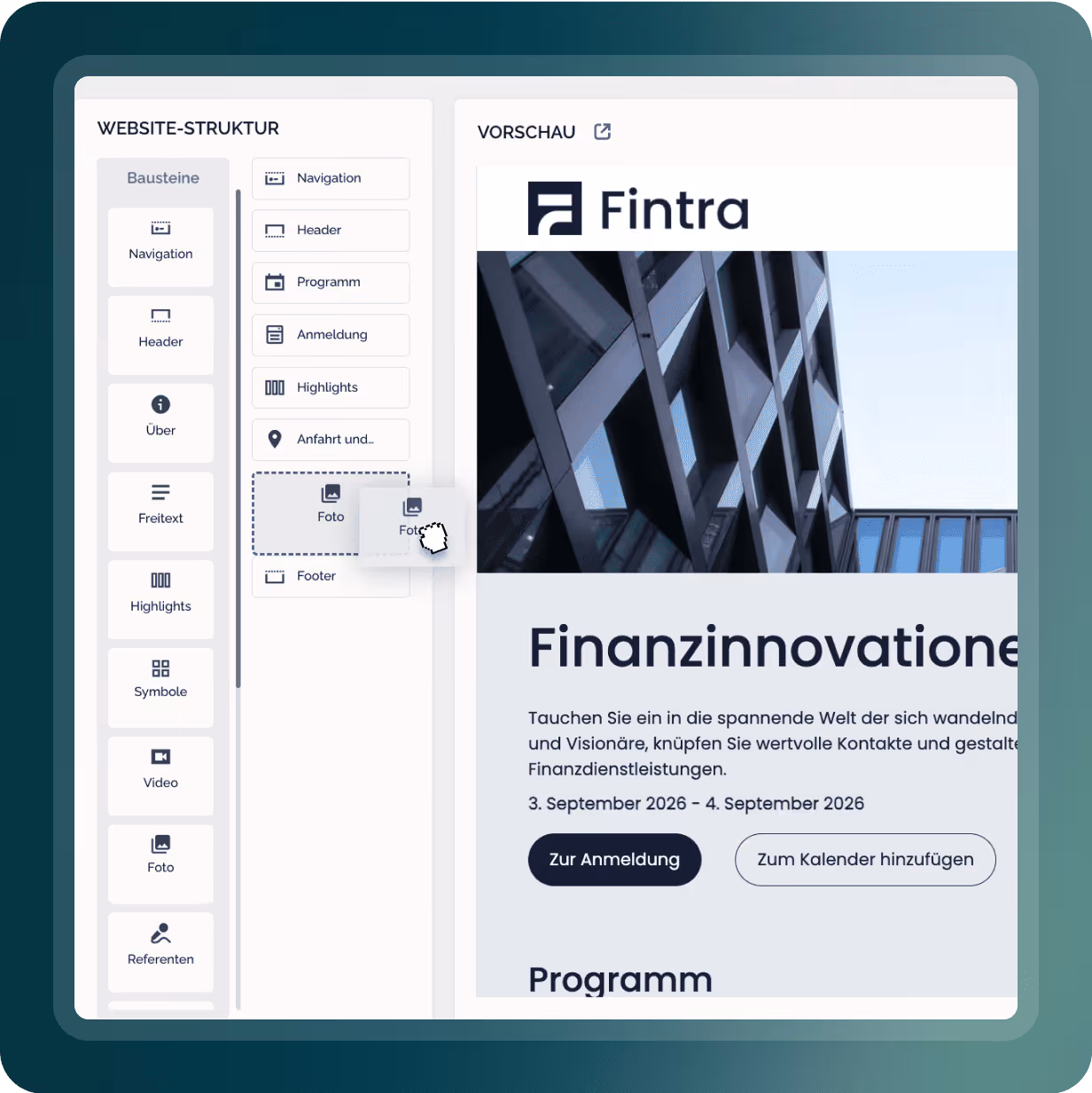 Mit unserem Drag-and-Drop Builder können Eventmanager in kurzer Zeit brand-konforme Websiten ohne IT-Support selbst designen, auf Gäste individualisieren und unter der Corporate Domain veröffentlichen.
